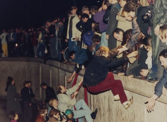 East Berliners get helping hands from West Berliners as they climb the Berlin Wall on November 10, 1989. (AP)