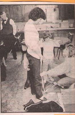 The Benson girls measuring for costumes with Bro. Benson in background
