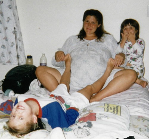 Pregnant with Andrew while giving Shelly a foot massage