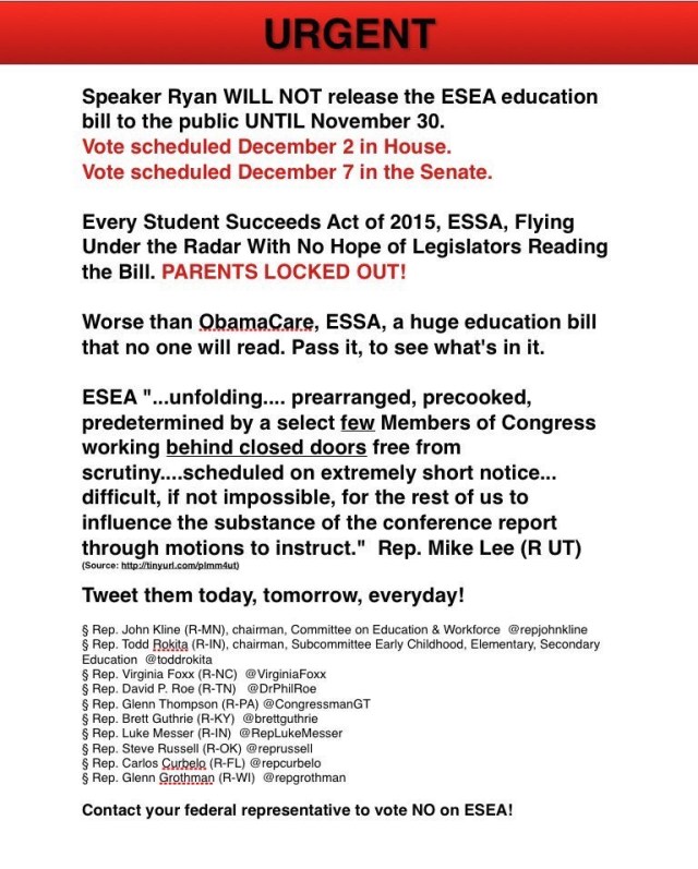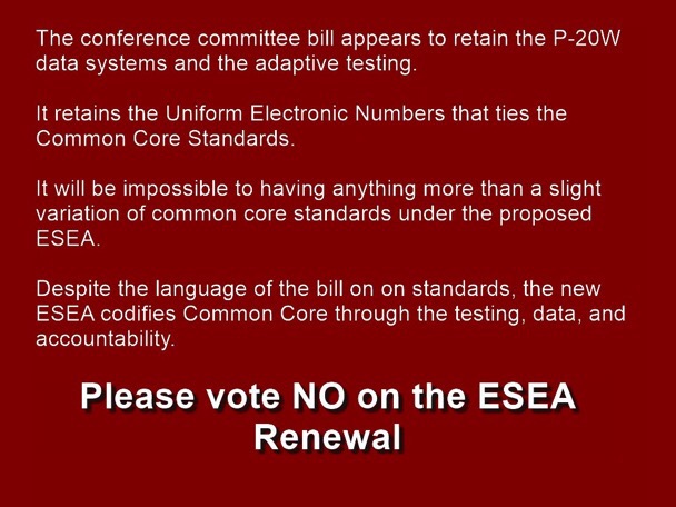 On Tuesday Congress is going to vote on an Education Bill, the ESEA (The Elementary and Secondary Education Act) that according to Utah Senator Mike Lee in a speech delivered on the Senate floor on Nov. 18th, will entrench Common Core.