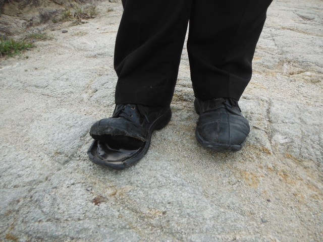 He related how his shoes had blown out, but a woman he is teaching gave him a new pair.