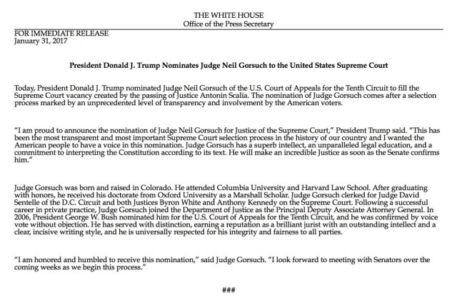 VIDEO: President Trump: Neil Gorsuch is my Supreme Court nominee pic.twitter.com/CxcqukWexM