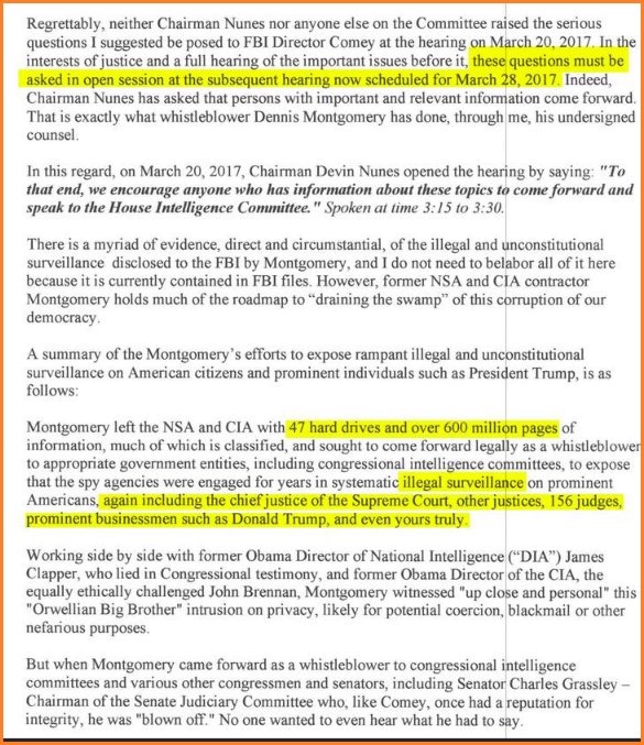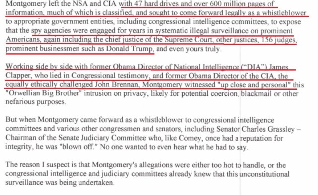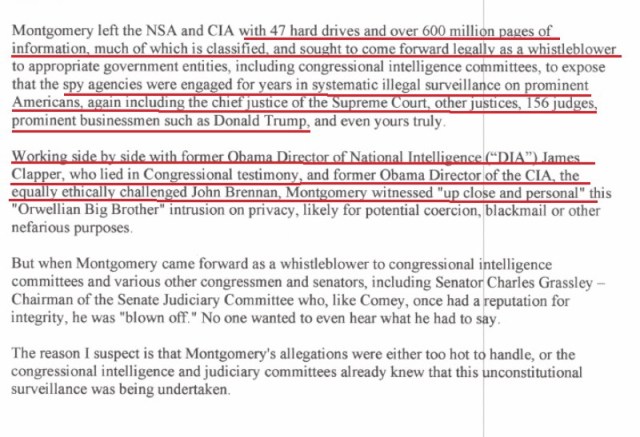 Montgomery left the NSA and CIA with 47 hard drives and over 600 million pages of information, much of which is classified, and sought to come forward legally as a whistleblower to appropriate government entities, including congressional intelligence committees, to expose that the spy agencies were engaged for years in systematic illegal surveillance on prominent Americans, including the chief justice of the Supreme Court, other justices, 156 judges, prominent businessmen such as Donald Trump, and even yours truly. Working side by side with Obama’s former Director of National Intelligence (DIA), James Clapper, and Obama’s former Director of the CIA, John Brennan, Montgomery witnessed “up close and personal” this “Orwellian Big Brother” intrusion on privacy, likely for potential coercion, blackmail or other nefarious purposes.