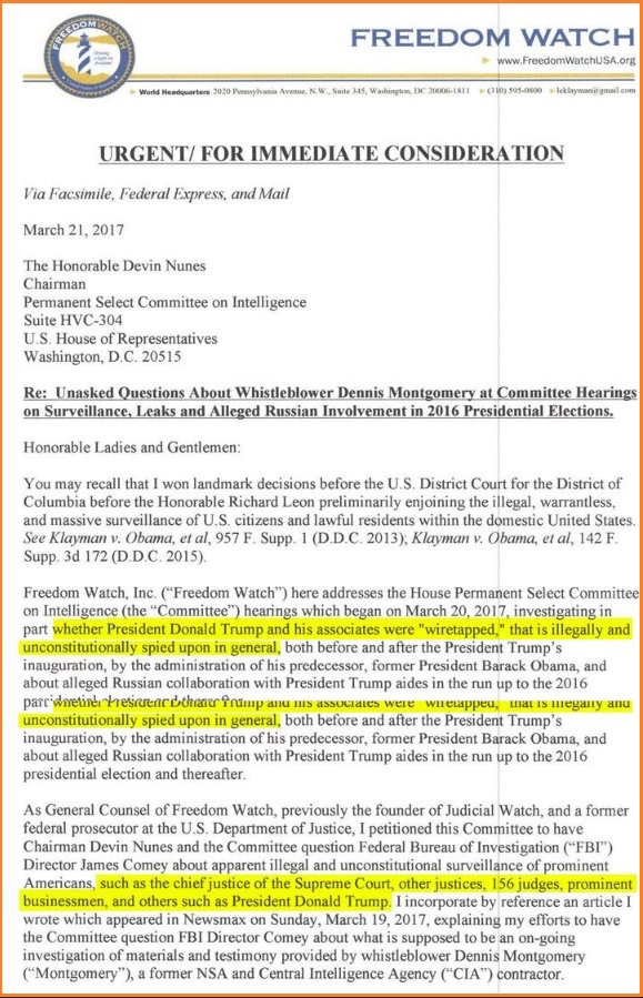 This interview, conducted and videoed by Special FBI Agents Walter Giardina and William Barnett, occurred almost two years ago, and nothing that I know of has happened since. It would appear that the FBI’s investigation was buried by Comey, perhaps because the FBI itself collaborates with the spy agencies to conduct illegal surveillance. In landmark court cases which I filed after the revelations of Edward Snowden, the Honorable Richard Leon, a colleague of Judge Lamberth, had ruled that this type of surveillance constituted a gross violation of the Fourth Amendment to the Constitution. (See http://www.freedomwatchusa.org for more information.)