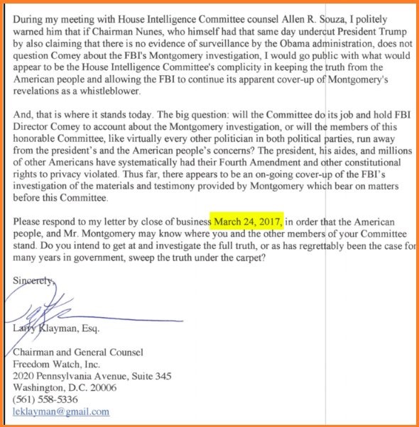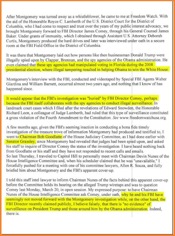 After Montgomery was turned away as a whistleblower, he came to me at Freedom Watch. With the aid of the Honorable Royce C. Lamberth of the U.S. District Court for the District of Columbia, who I had come to respect and trust over the years of my public interest advocacy, we brought Montgomery forward to FBI Director James Comey, through his General Counsel James Baker. Under grants of immunity, which I obtained through Assistant U.S. Attorney Deborah Curtis, Montgomery produced the hard drives and later was interviewed under oath in a secure room at the FBI Field Office in the District of Columbia. There he laid out how persons like then-businessman Donald Trump were illegally spied upon by Clapper, Brennan, and the spy agencies of the Obama administration. He even claimed that these spy agencies had manipulated voting in Florida during the 2008 presidential election, which illegal tampering resulted in helping Obama to win the White House.