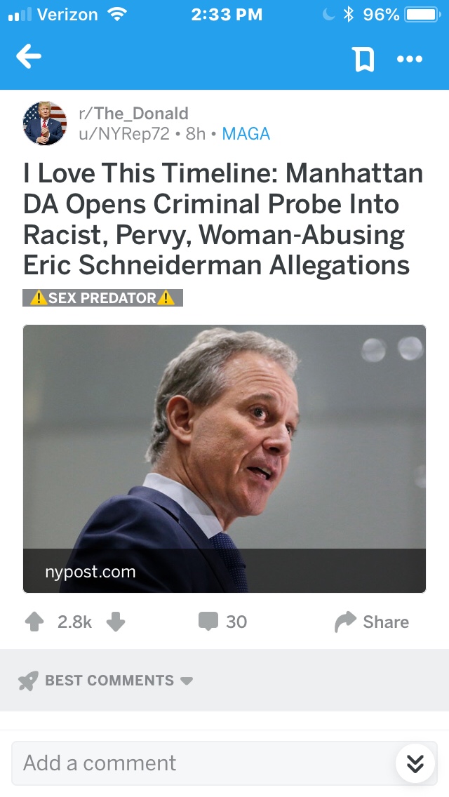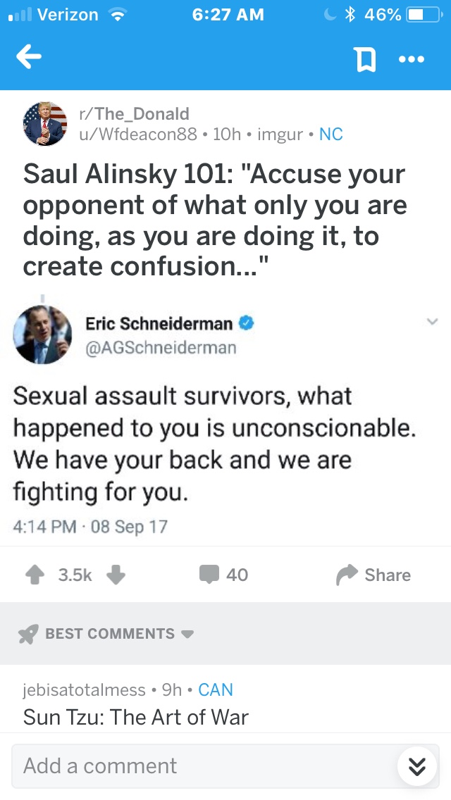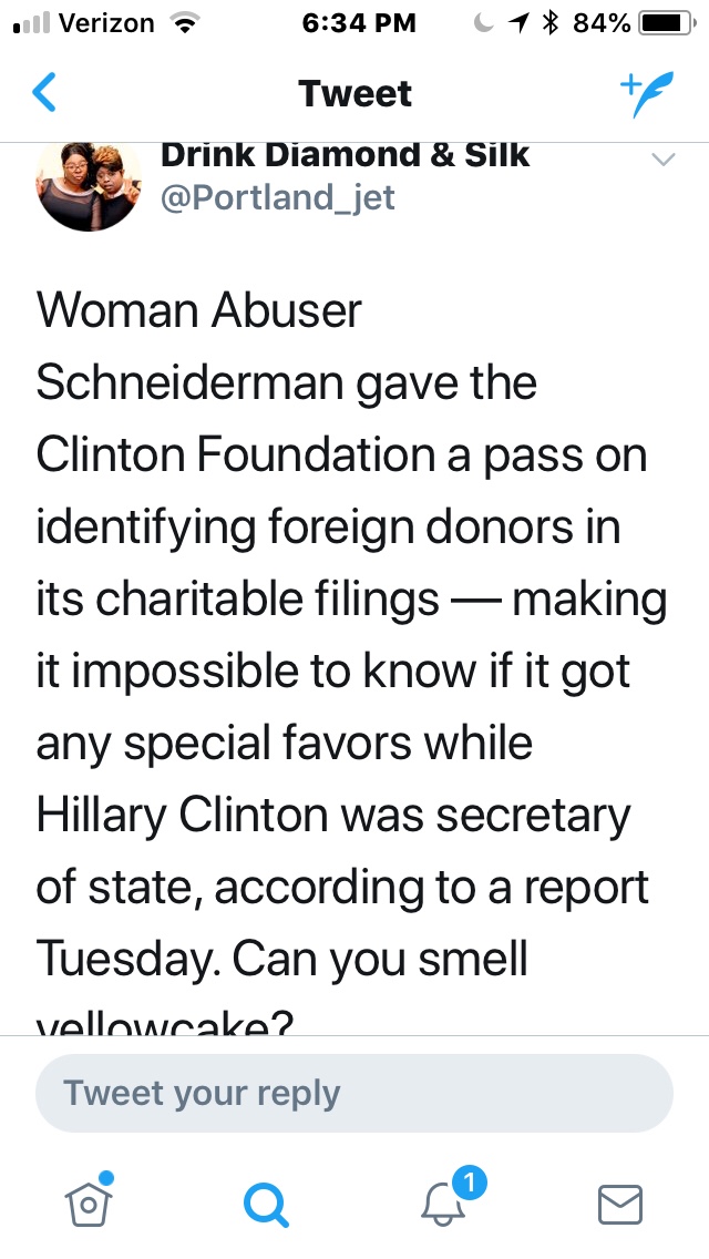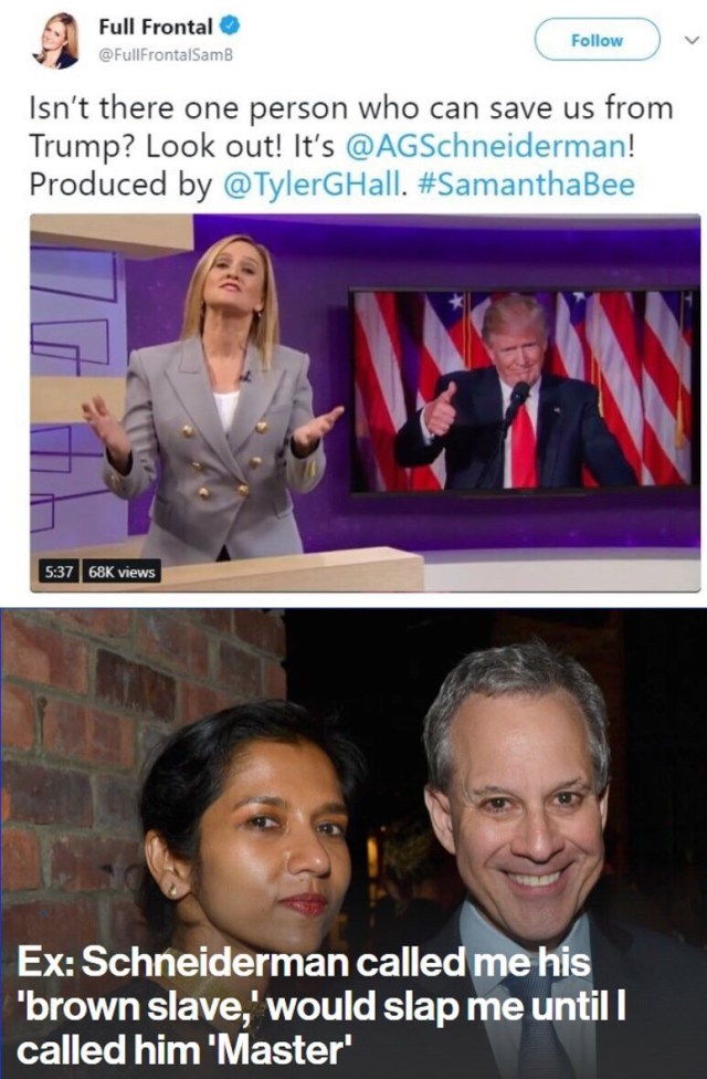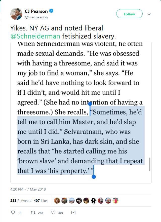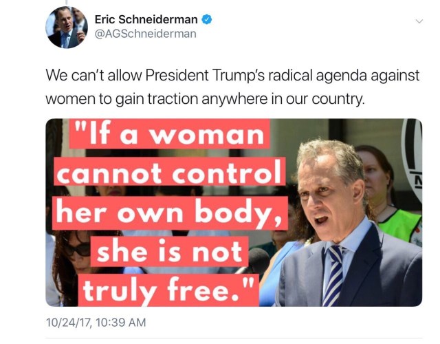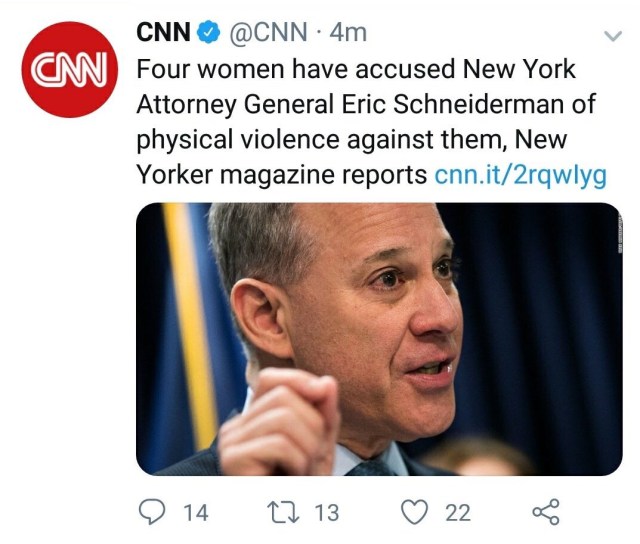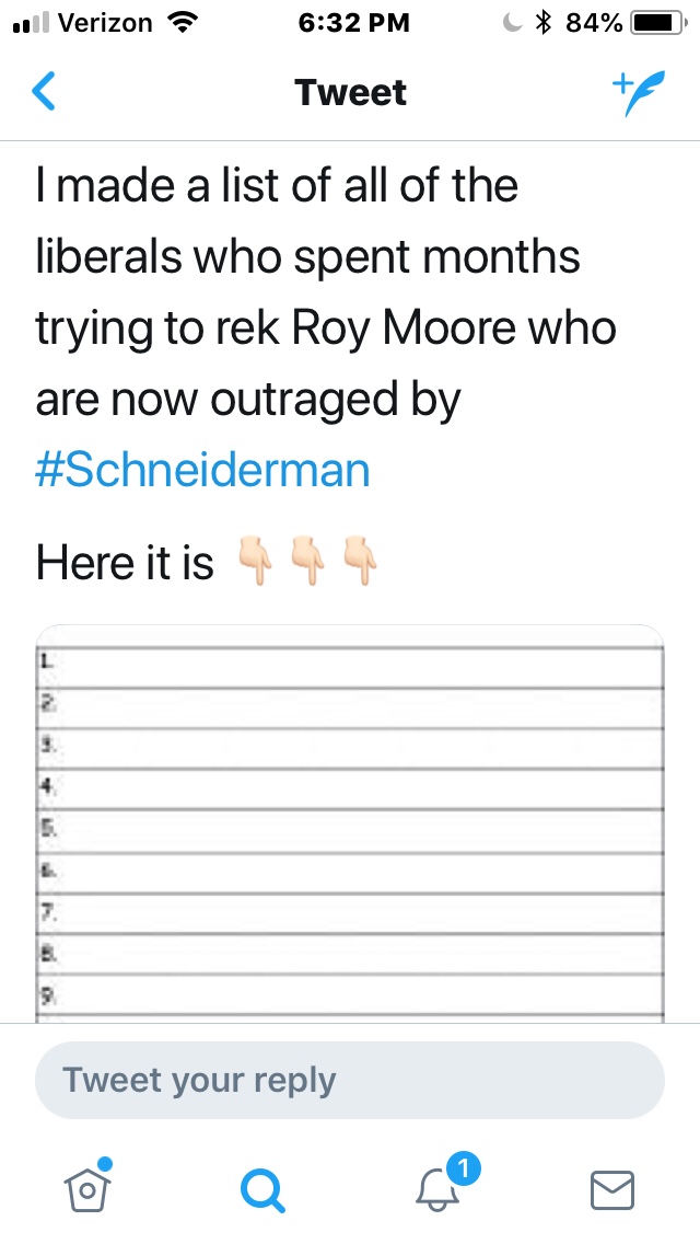I’m confused. I’ve seen lots of “leftists” on twitter outraged about Schneiderman. Roy Moore did terrible things. We now know that Schneiderman did terrible things. Can we just agree that’s bad instead of going for a “gotcha” because nobody wins here.